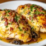 Transfer the cooked chicken breasts to a baking dish. Evenly top each piece with the sautéed mushrooms, followed by the crispy bacon slices, and then sprinkle with 2 cups of shredded Monterey Jack cheese for a generous layer.