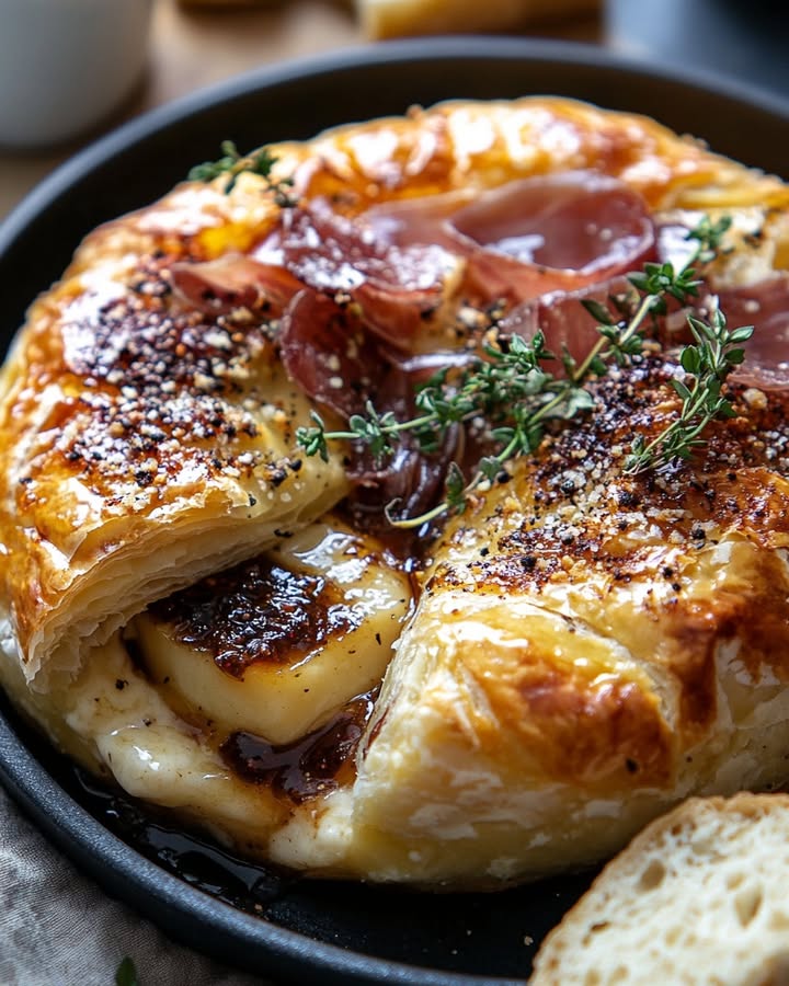 An elegant and impressive appetizer featuring creamy brie cheese wrapped in flaky puff pastry, topped with sweet fig jam, salty prosciutto, and a drizzle of honey.