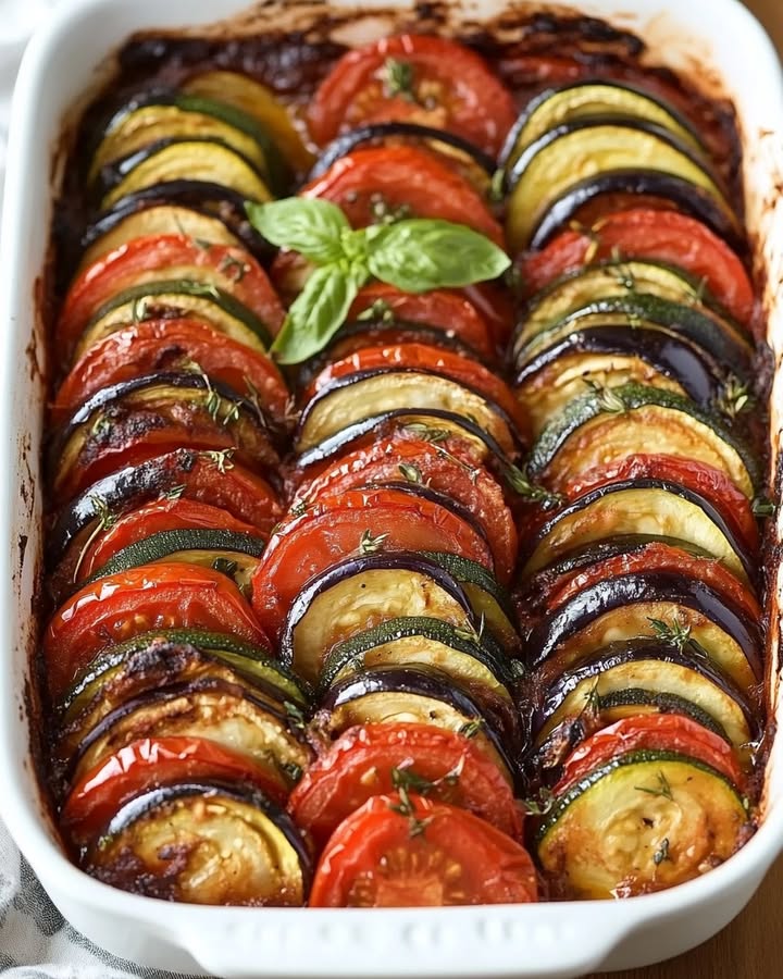 A classic, rustic French Provençal stewed vegetable dish, baked to perfection with layers of tomato, zucchini, and eggplant in a rich herbed tomato sauce.