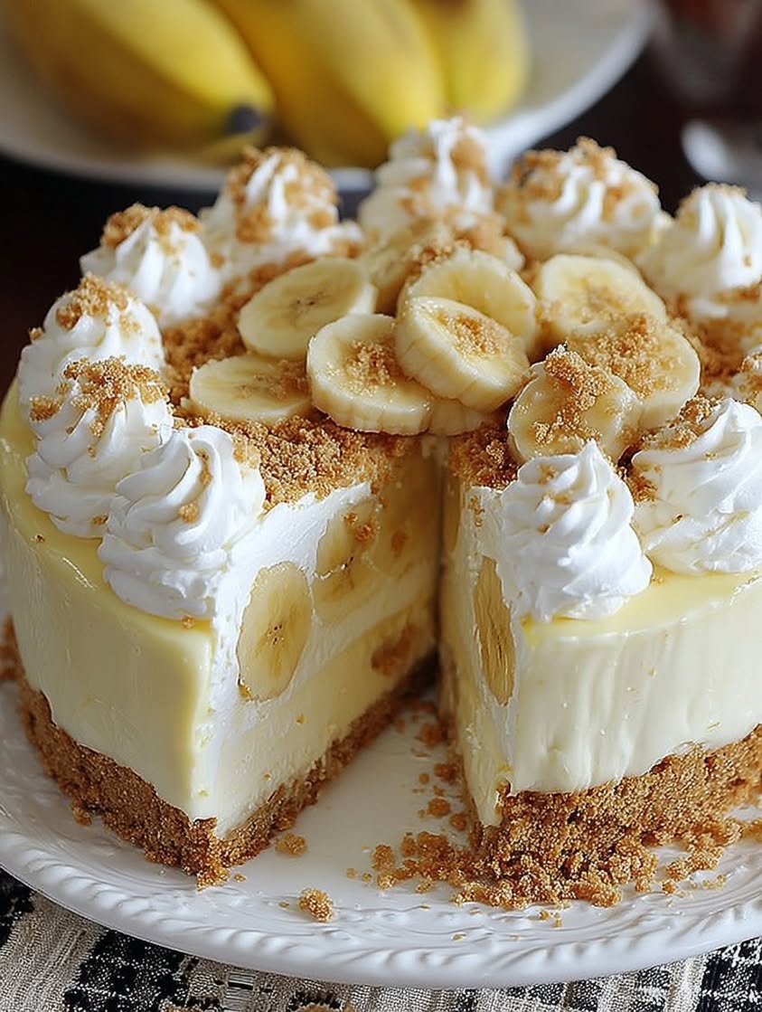 A creamy cheesecake with layers of banana pudding and vanilla wafers, perfect for a delightful dessert.