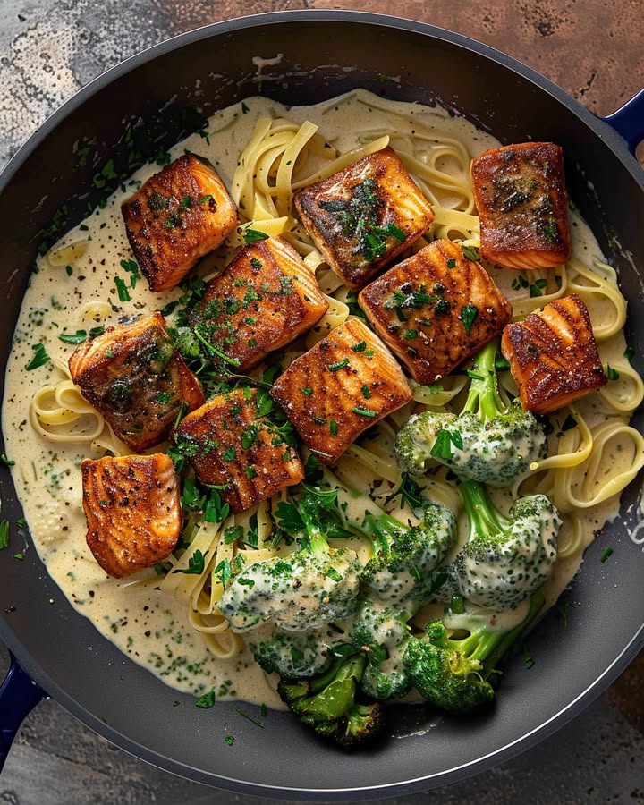 A flavorful and creamy dish featuring blackened salmon and tender broccoli in a rich Alfredo sauce.