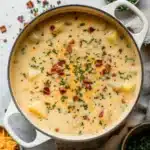 A creamy potato soup loaded with bacon, cheese, and green onions, perfect for a comforting meal.