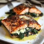 The sensory appeal of this Blackened Salmon Stuffed with Spinach Parmesan is truly captivating. As the salmon sears, the kitchen fills with an aromatic blend of smoky spices from the blackened seasoning mingling with the earthy notes of fresh spinach and the nutty richness of melted Parmesan. Each bite offers a delightful contrast: the crispy, charred outer layer gives way to a tender, juicy center where the spinach-Parmesan stuffing creates a velvety texture that coats your palate. This recipe’s flavors are a harmonious symphony—spicy cajun heat balanced by the subtle garlic undertones and the salty tang of cheese, making it not just a meal, but a memorable culinary adventure that will have your family asking for seconds.