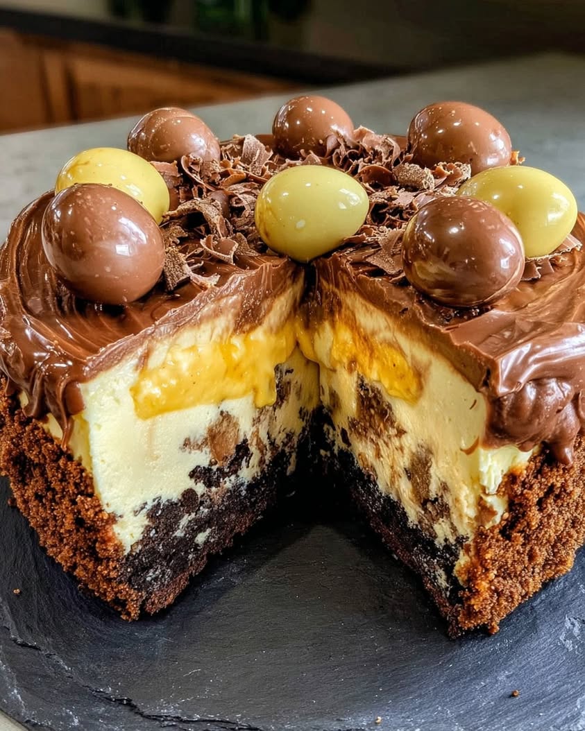 A decadent cheesecake featuring a creamy blend of milk and white chocolate with a crunchy Oreo crust, topped with Cadbury chocolate eggs.