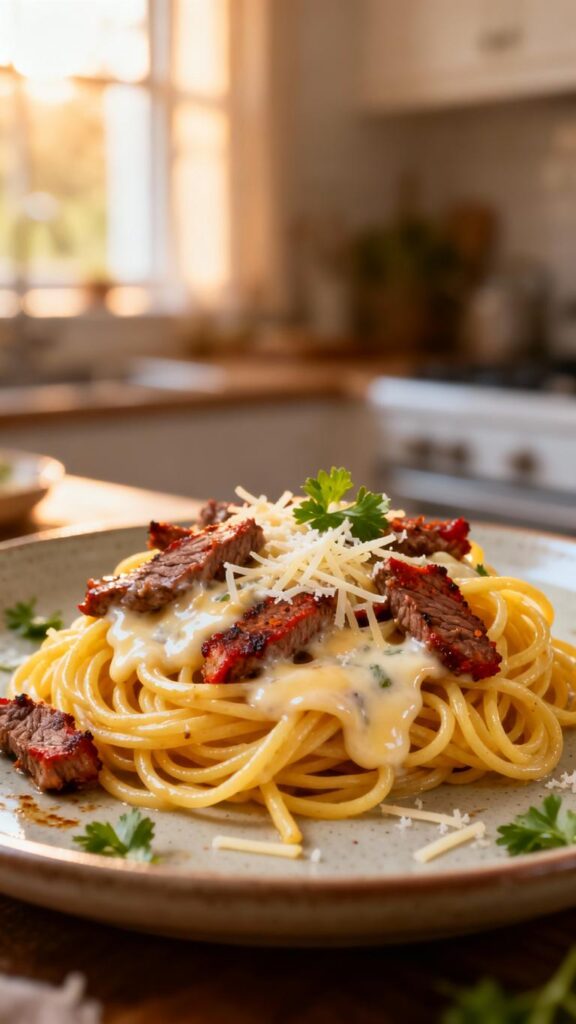 Cajun Beef Spaghetti in Creamy Three Cheese Parmesan Sauce