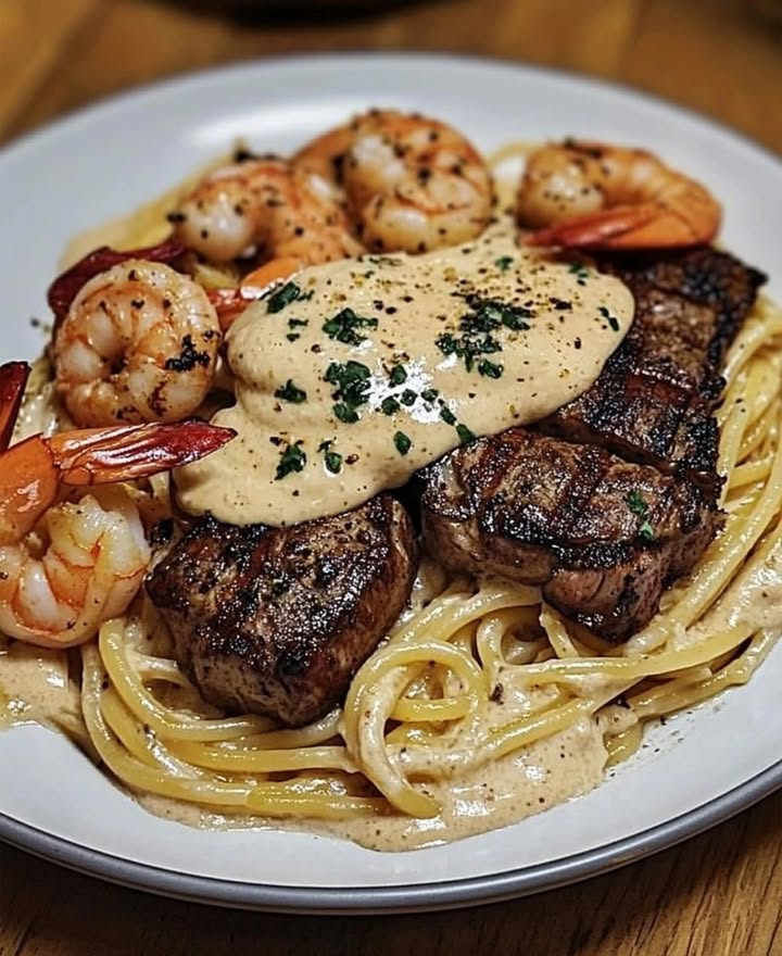 A rich and creamy pasta dish featuring tender steak and succulent shrimp, all tossed in a homemade Alfredo sauce with a kick of Cajun seasoning.
