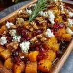 For an impressive presentation of this Caramelized Butternut Squash with Feta, Walnuts & Cranberry-Honey Glaze, arrange the roasted squash in a shallow serving bowl to highlight its golden colors. Garnish with a few fresh herbs like rosemary or thyme for a pop of green, adding visual appeal and a subtle earthy note. This side dish pairs beautifully with roasted meats like turkey or pork, providing a sweet-savory balance, or serve it alongside grilled chicken for a lighter meal. For vegetarians, it’s a fantastic addition to grain bowls or salads, where the cranberry-honey glaze can double as a dressing element.