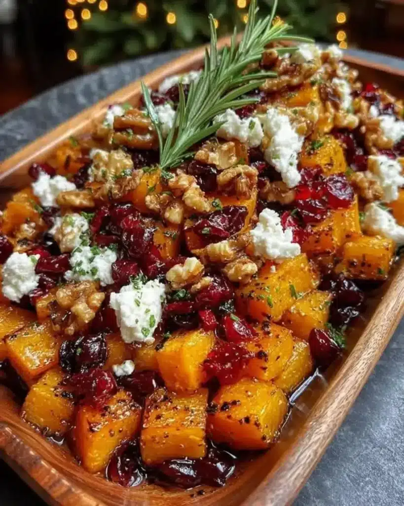 A delightful side dish featuring caramelized butternut squash topped with feta, walnuts, and a sweet cranberry-honey glaze.