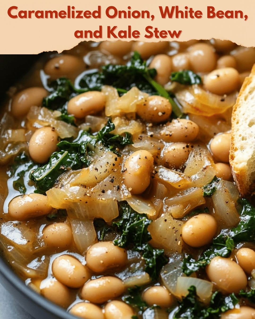 A hearty and nutritious stew featuring sweet caramelized onions, creamy white beans, and nutrient-rich kale.