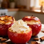 Baked apples stuffed with a creamy cheesecake filling, perfect for a dessert.