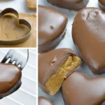 Pro Tip: Use a fork to gently lift the hearts out of the chocolate, letting excess drip off for a clean, professional finish on your Chocolate Peanut Butter Valentine’s Hearts.