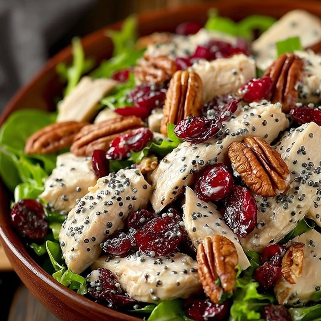 A refreshing and flavorful salad combining tender chicken, sweet cranberries, crunchy pecans, and a tangy poppy seed dressing.