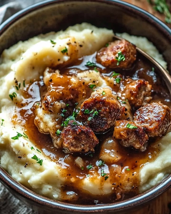 A comforting and hearty dish featuring velvety smooth mashed potatoes infused with sweet roasted garlic, all smothered in a rich and savory sausage gravy.