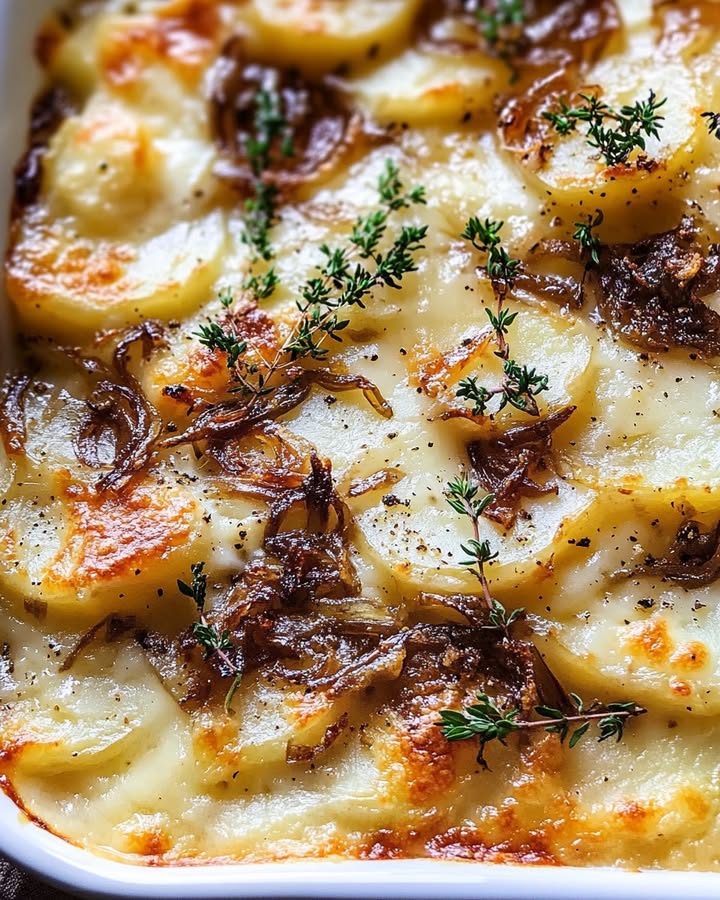 Layers of tender potatoes baked in a rich, creamy sauce with sweet caramelized onions and nutty Gruyere cheese.