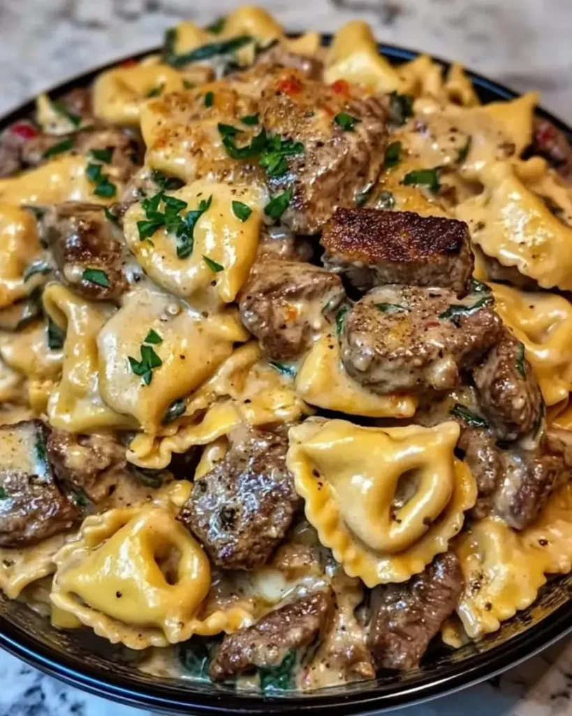 Return the reserved steak bites to the skillet with the tortellini and sauce, then toss gently over low heat for 1-2 minutes until everything is evenly coated and heated through. This step ensures a harmonious blend of flavors.