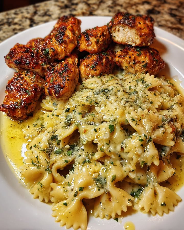 - Add the drained bowtie pasta to the skillet and toss until everything is evenly coated in the creamy sauce. Garnish with fresh parsley and serve immediately.