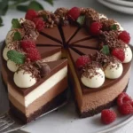 Fresh raspberries and chocolate shavings for garnish add a fresh, tangy contrast and visual appeal to your Decadent Triple Chocolate Mousse Torte. Choose ripe, seasonal berries for the best flavor, and they can be swapped with strawberries for a different twist, enhancing the dessert’s presentation.