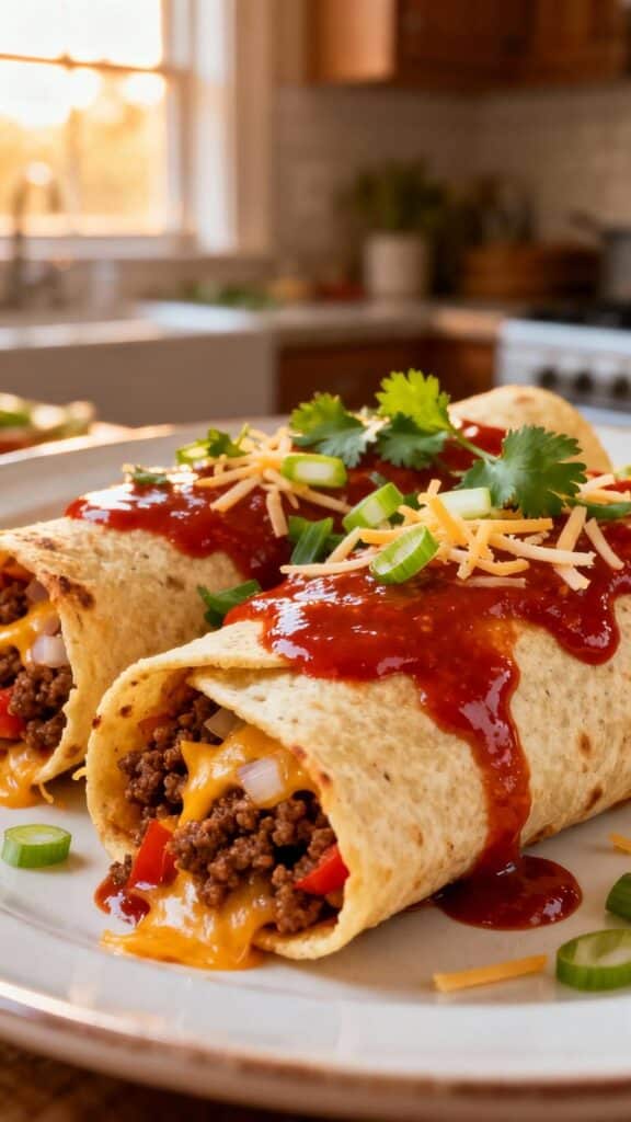 Spoon the seasoned beef mixture evenly into each of the 8 flour tortillas, roll them up tightly, and place them seam-side down in a greased baking dish. This assembly is where the magic happens—roll like a pro to avoid leakage, and line them up like soldiers ready for battle. Use a spoon to portion the beef accurately, ensuring each enchilada is stuffed generously but not overflowing. Tip: If tortillas are stiff, microwave them wrapped in a damp paper towel for 20 seconds to make rolling a breeze.
