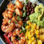 Corn kernels, avocado, cherry tomatoes, fresh cilantro, and lime wedges: One cup of corn kernels brings sweetness and crunch, while avocado (sliced) adds creamy richness. Halved cherry tomatoes provide juicy acidity, cilantro offers fresh herbal notes, and lime wedges brighten everything. Use fresh, in-season produce for peak flavor—frozen corn works in a pinch, but substitute with bell peppers for avocado if it’s unavailable, and always opt for ripe fruits for the best taste in your Shrimp Burrito Bowls Your Easy Flavorful Dinner Fix.