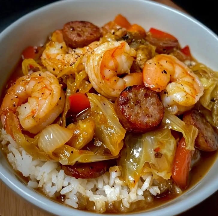 A flavorful and hearty bowl featuring succulent shrimp, savory sausage, tender cabbage, and fluffy rice, all cooked in a delicious blend of spices.