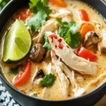 Picture the tantalizing aroma of fresh ginger and garlic wafting through your home as you prepare this Thai Chicken Soup Recipe Easy Flavorful Comfort in a Bowl. Each spoonful delivers a harmonious mix of textures—tender, juicy chicken thighs that melt in your mouth, paired with the slight crunch of red bell peppers and mushrooms. The extra creamy coconut base adds a velvety richness, while the bright notes of lime juice and fish sauce create a symphony of flavors: spicy, sweet, sour, and savory. It’s not just soup; it’s an explosion of Thai-inspired comfort that warms you from the inside out, making every bite an adventure.