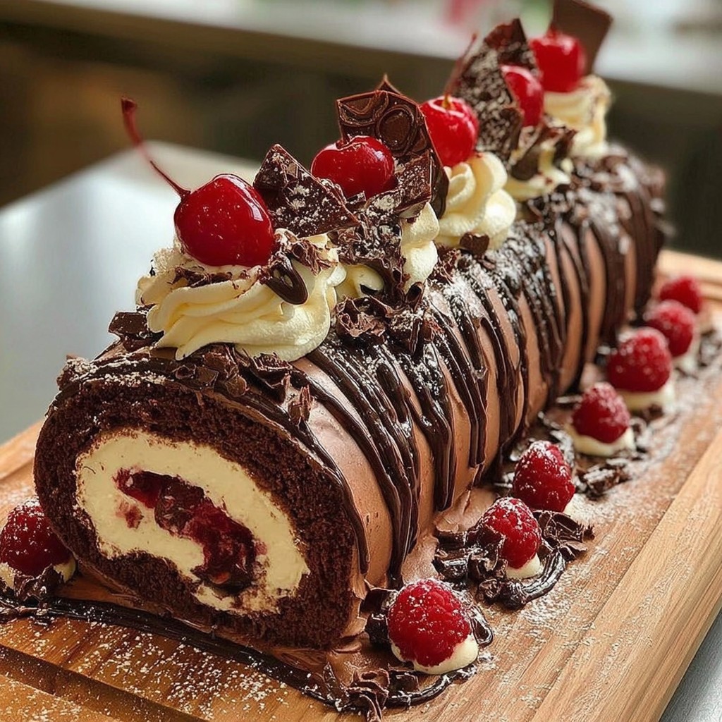 This elegant and delicious Black Forest roll cake is a perfect blend of chocolate, cherries, and cream, capturing the essence of the classic German dessert in a convenient roll.