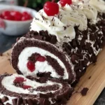 An elegant chocolate roll cake filled with cherries and whipped cream, inspired by the classic Black Forest dessert.