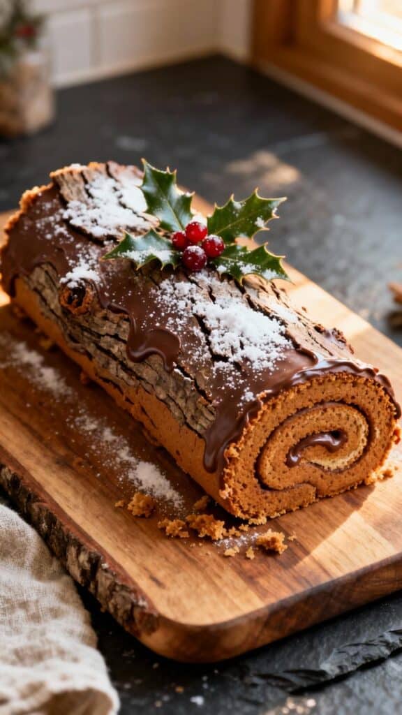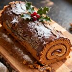 A festive twist on the classic Yule log cake with gingerbread flavors, perfect for holiday celebrations.