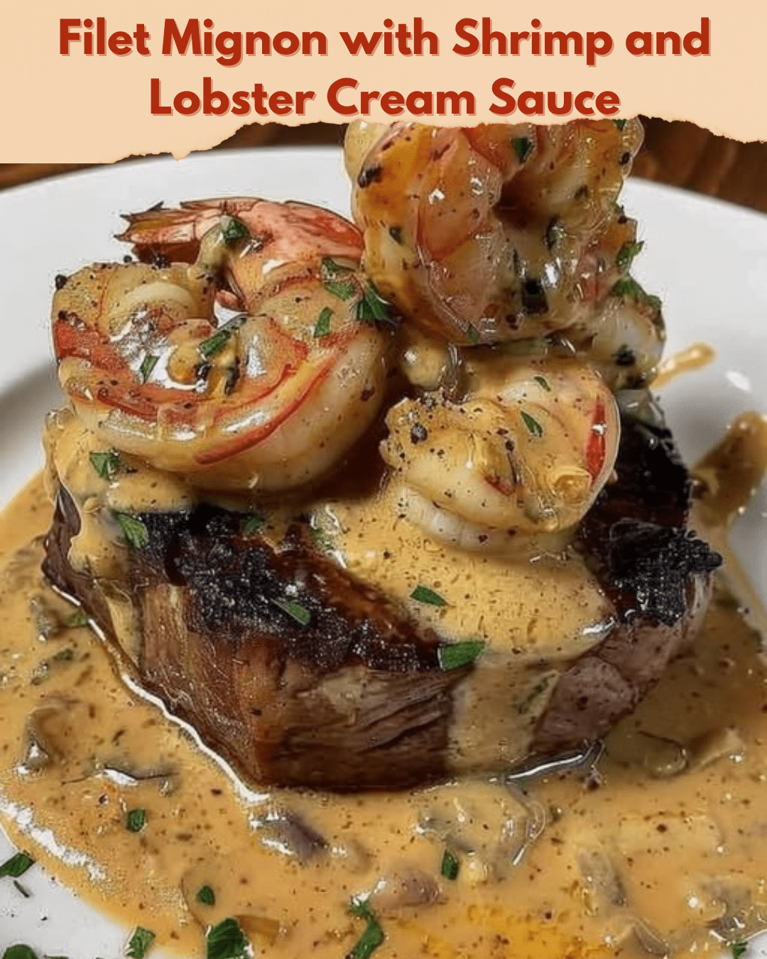 A luxurious surf and turf dish featuring tender filet mignon, succulent shrimp, and a rich lobster cream sauce.