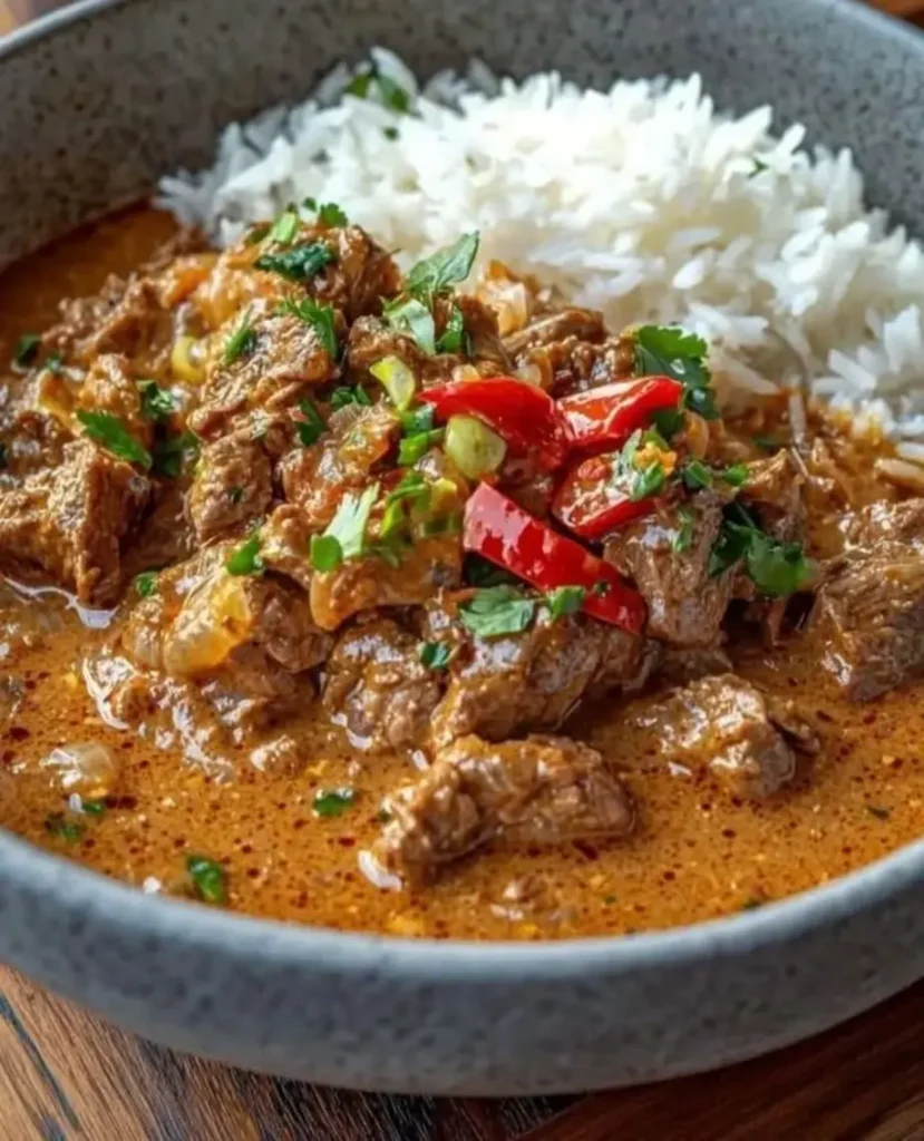 This aromatic Panang beef curry features tender beef simmered in a rich, creamy sauce with Thai herbs and spices, paired with fluffy coconut rice for a comforting meal.