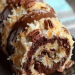 A rich and indulgent roll cake featuring layers of chocolate cake filled with a creamy coconut and pecan frosting, perfect for chocolate lovers.