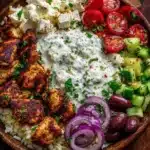 The Chef’s Secret to this Greek chicken souvlaki bowls with garlic sauce lies in our zesty lemon-infused marinade, which uses fresh lemon juice to tenderize and flavor the chicken like no other. This technique infuses every cube with bright, citrusy notes that penetrate deeply, creating a juicy explosion of Greek-inspired goodness. Unlike standard marinades, the combination of garlic, oregano, and olive oil in this blend ensures the chicken remains moist during grilling, preventing dryness and enhancing the overall Mediterranean profile for an unmatched taste.
