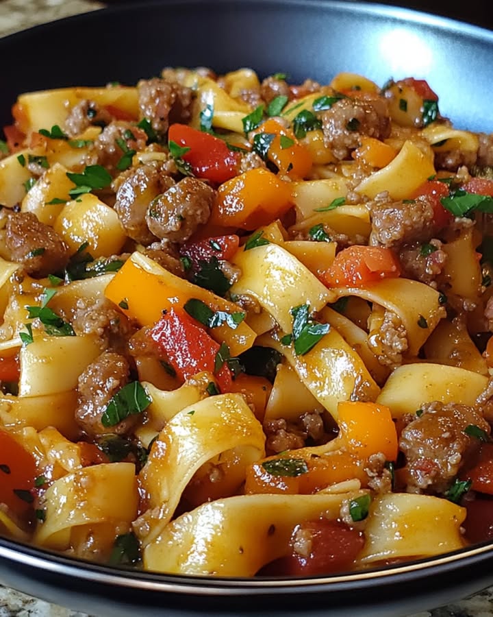 While the pasta is cooking, heat the olive oil in a large skillet or Dutch oven over medium-high heat. Add the Italian sausage and cook, breaking it up with a spoon, until browned and cooked through. Remove the sausage from the skillet and set aside. Pro Tip: For extra flavour, try browning the sausage to a deeper golden brown. This is where the true umami notes emerge that will be infused into your Italian Drunken Noodles.