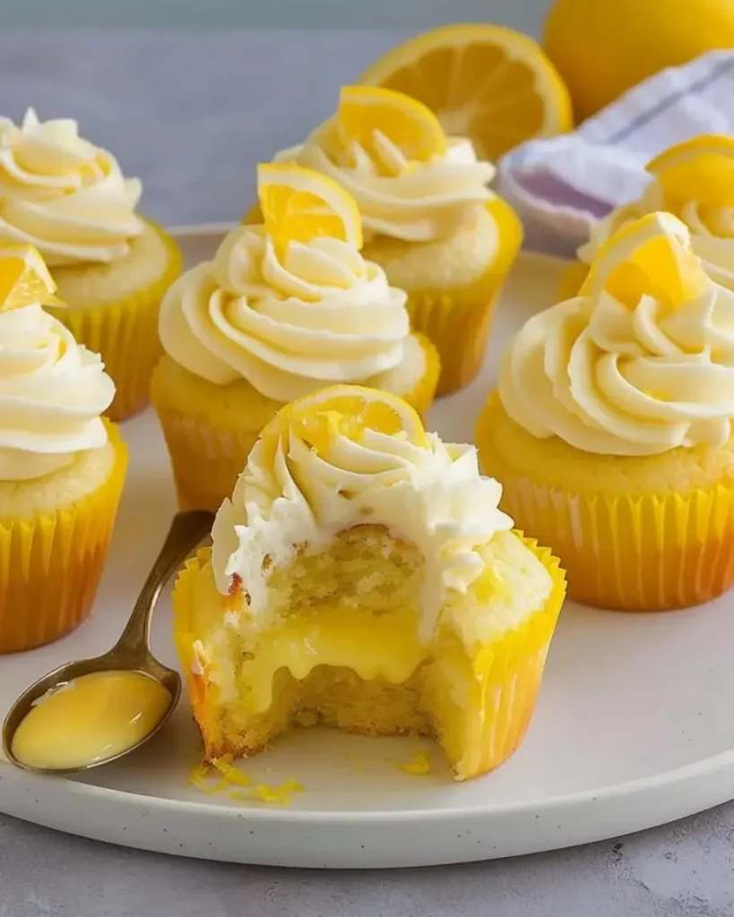 Moist lemon cupcakes filled with tangy lemon curd and topped with creamy frosting.
