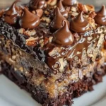A rich and indulgent chocolate poke cake inspired by German chocolate flavors, featuring layers of moist cake soaked in caramel and topped with coconut pecan frosting.