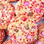 Delicious heart-shaped cookies loaded with colorful M&M’s, perfect for Valentine’s Day treats.