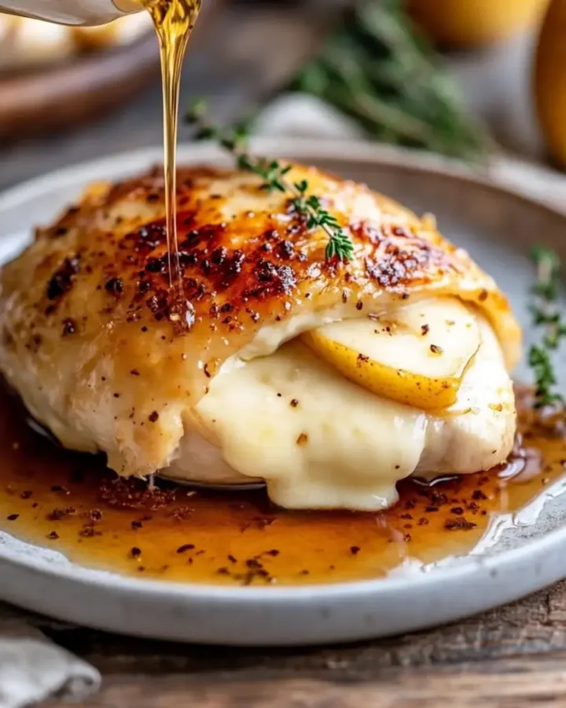 For an impressive presentation, slice the stuffed chicken at an angle to reveal the decadent creamy stuffing, then artfully drizzle the spiced apple cider reduction over the top. Garnish with fresh thyme or pear slices for a pop of color and elegance. Complement this dish with sides like roasted Brussels sprouts for a nutty contrast or wild rice pilaf to soak up the savory juices, making your Pear Camembert Stuffed Chicken with Spiced Apple Cider Reduction the star of any meal.