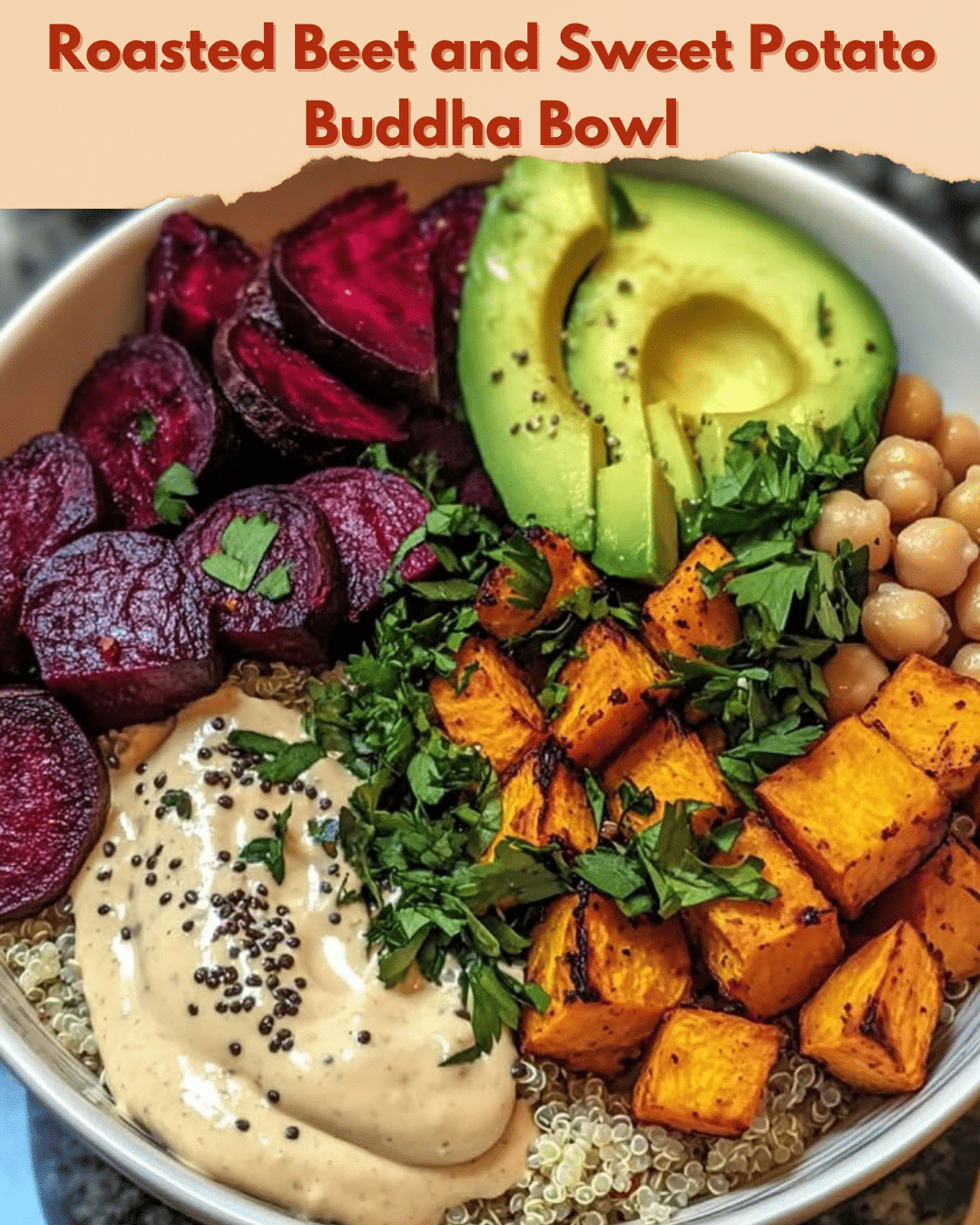 A vibrant and nutritious Buddha bowl featuring roasted beets and sweet potatoes, served with quinoa and a creamy tahini dressing.