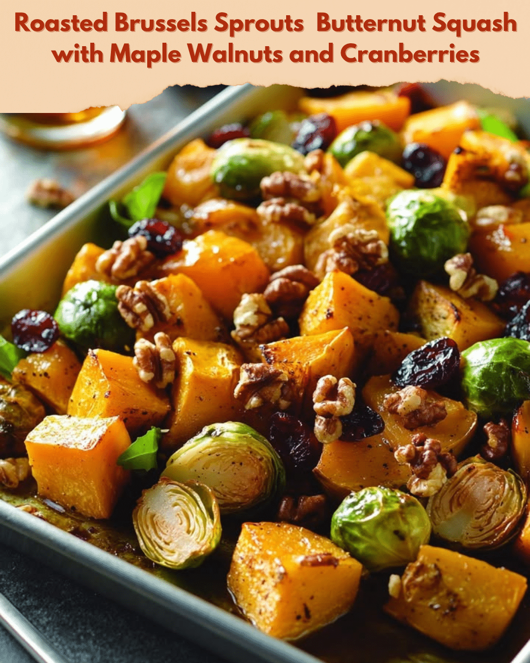 A delightful and flavorful fall dish featuring roasted Brussels sprouts, butternut squash, with maple-glazed walnuts and cranberries.