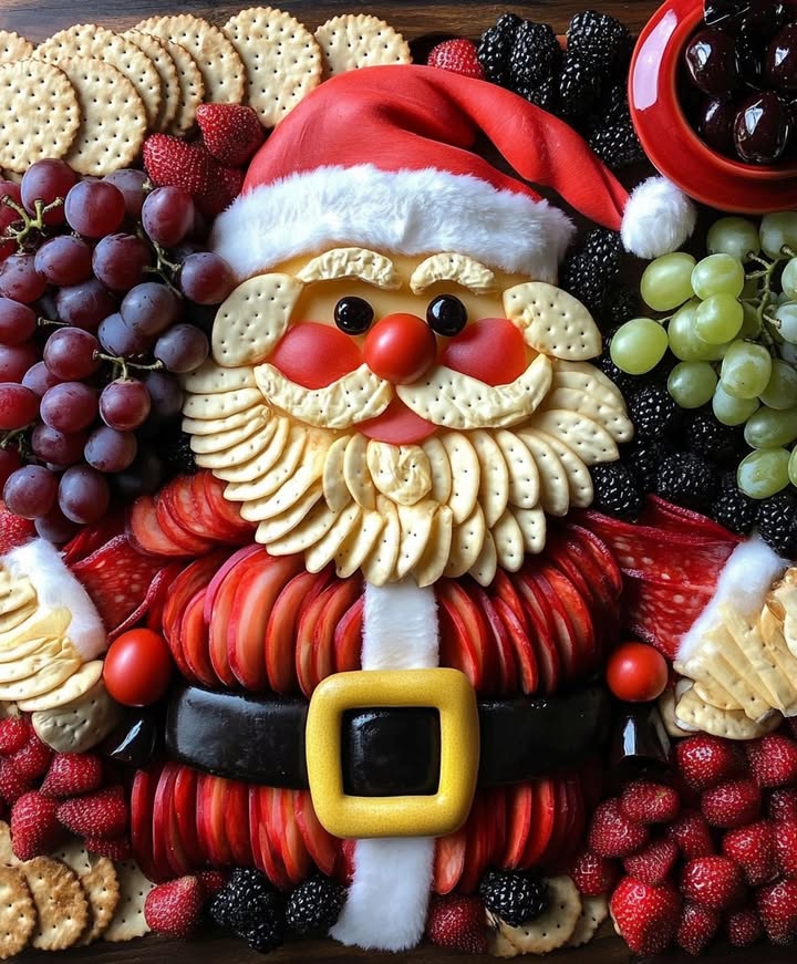 A festive and adorable holiday cheese board arranged to look like Santa Claus. It’s a delicious and visually stunning centerpiece for any Christmas gathering.