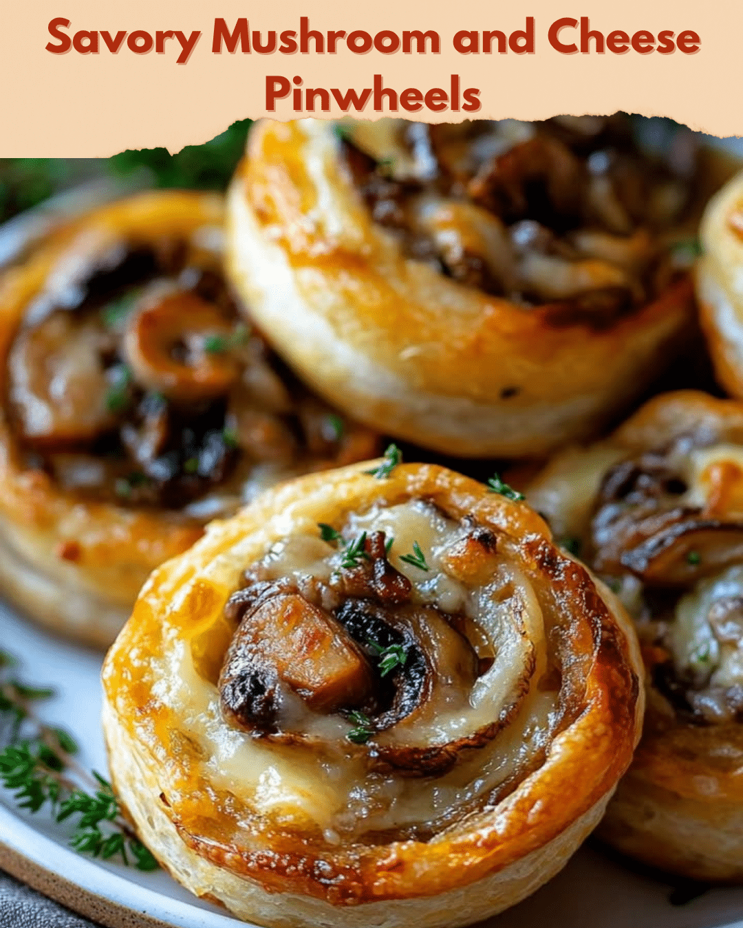 Delicious puff pastry pinwheels filled with sautéed mushrooms and melted cheese, perfect for appetizers or snacks.