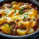 A hearty slow cooker dish featuring layers of potatoes, ground beef, cheese, and seasonings for an easy family meal.