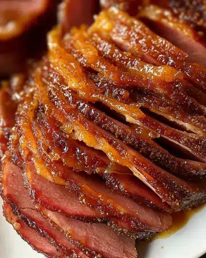 - Pour the glaze mixture over the ham, ensuring it seeps into the slices.