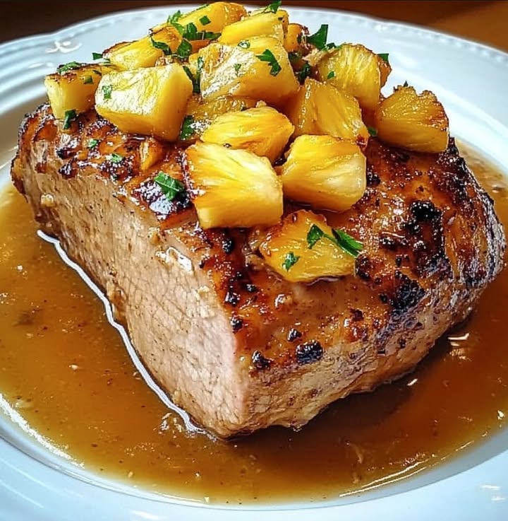 A sweet and savory dish featuring a tender pork loin slow-cooked in a tangy pineapple and soy sauce glaze.
