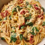 A creamy pasta dish featuring spaghetti tossed with fresh spinach, sun-dried tomatoes, and chicken in a rich cream sauce.