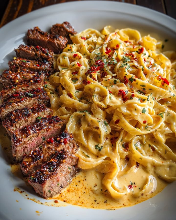 Spicy Cajun Garlic Butter Steak with Creamy Parmesan Fettuccine
