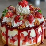 This Strawberries and Cream Cheesecake Cake delights the senses with its luxurious layers: a buttery graham cracker crust that crumbles just right, giving way to a thick, creamy filling that’s infused with the bright, juicy essence of fresh strawberries. Each bite offers a symphony of textures—from the smooth, velvety cheesecake that melts in your mouth to the slight tartness of ripe strawberries that adds a refreshing contrast. The aroma of vanilla and baked cream cheese fills the kitchen, evoking memories of warm berry-filled desserts, while the subtle sweetness lingers, making it impossible to stop at just one slice. It’s a dessert that not only satisfies your sweet tooth but also elevates any occasion with its elegant, homemade appeal.