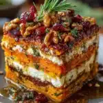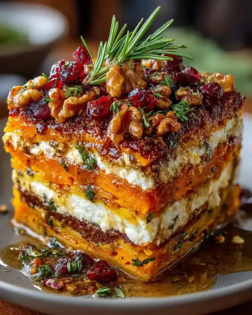 A festive layered lasagna featuring sweet potatoes, butternut squash, and carrots, topped with feta cheese, walnuts, and a sweet cranberry-honey glaze.