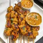 These Thai curry chicken skewers are marinated in a flavorful blend of spices and served with a creamy coconut peanut dip for a perfect balance of savory and sweet.