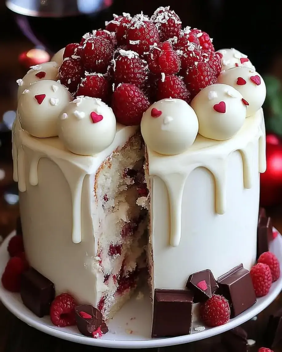 9. For the frosting: Beat butter until creamy, then gradually add powdered sugar, melted white chocolate, and heavy cream. Frost the cake and garnish with fresh raspberries.
